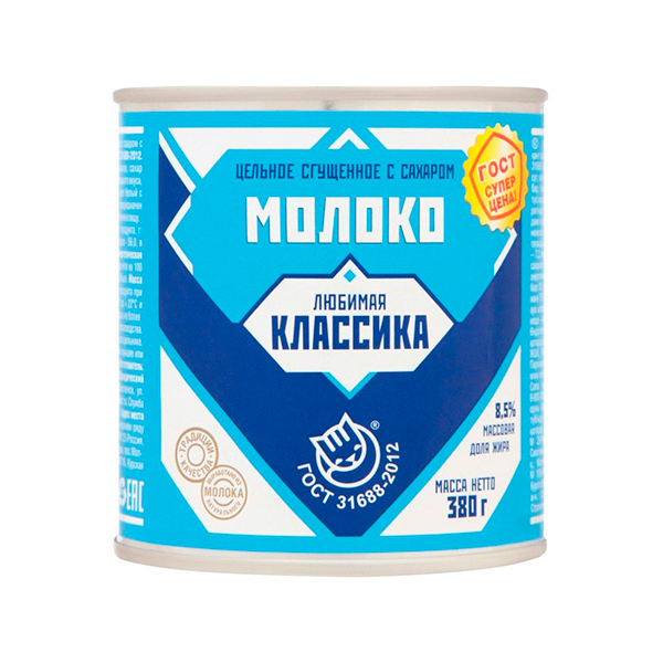 Молоко цельное сгущенное с сахаром ГОСТ, 380г, 8.5%, жест.упаковка