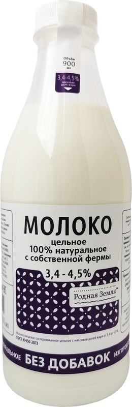 Молоко пастеризованное цельное, 900мл, 3.4 - 4.5%, пласт.бутылка