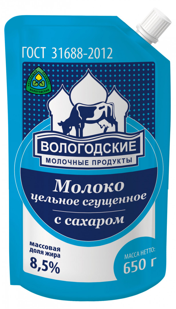 Молоко сгущенное цельное с сахаром, 650г, 8.5%, дой-пак
